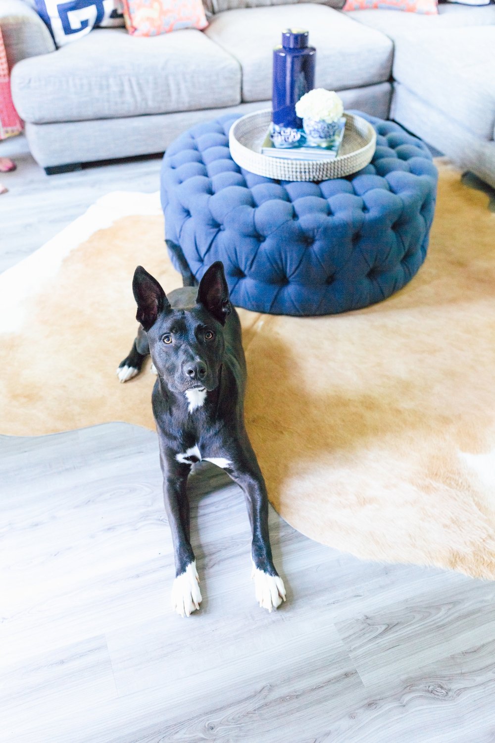 When we first bought our house, we had no idea what to do with this bright but tiny room. We originally made it into a dining room, then we changed it to a sitting room for guests, but it’s so bright and cozy that we eventually turned it into our family room/TV room. We spend so much time in the room watching movies, playing with the baby and the dog, and my daughter is constantly crawling around, so we really wanted the floors to be bright and comfortable and easy to clean.